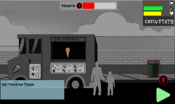 Story driven game where you are having an intense episode of irrational fear linked to anxiety and stress and feel like everyone is watching you. Balancing your own paranoia and stress levels and fulfilling the needs of your child as you try to make your way home.